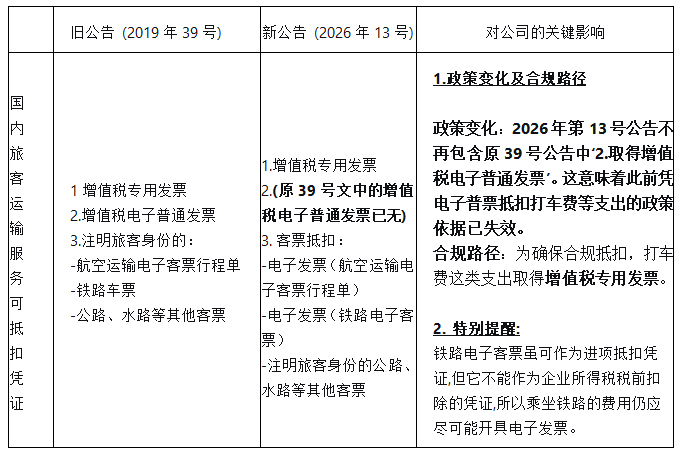 原政策(2019年第39號公告)中購進國內旅客運輸服務可以進項抵扣的“增值稅電子普通發票”(比如網約車、出租車開具的普通電子發票)并未被包含在新政策(2026年第13號公告)明確列舉的進項抵扣范圍之內。